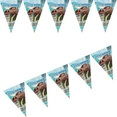 Moana flama bayrak 2 metre uzunluğunda sıralı bir şekilde dizili toplam 10 adet bayraktan oluşmaktadır. Moana flama bayrağın ebatları 17*23 cm'dir. Doğum günü partinizi renklendirecek süsleme çeşitlerinden biridir.
