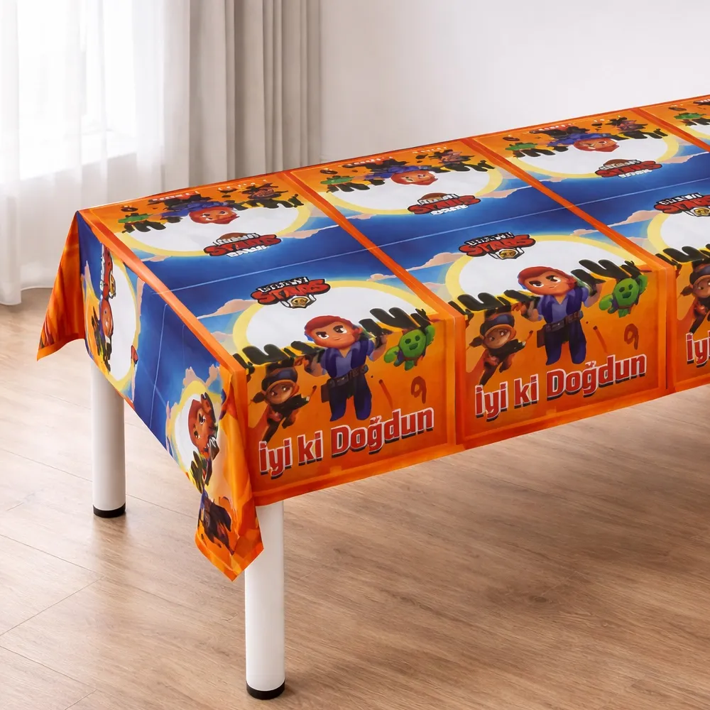 Brawl Stars masa örtüsü, parti masasına canlı ve temaya uygun bir görünüm kazandırır. 120x180 cm ölçüsü sayesinde geniş alan kaplar. Doğum günü ve çocuk partileri için ideal bir tamamlayıcıdır.