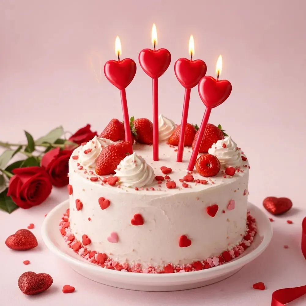 - Kırmızı kalp tasarımlı çubuklu pasta mum seti