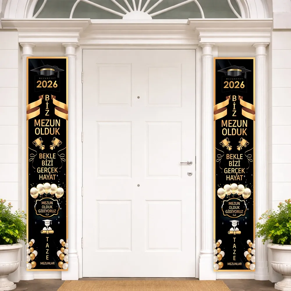 - Mezuniyet törenleri için özel tasarlanmış 2’li asma afiş seti