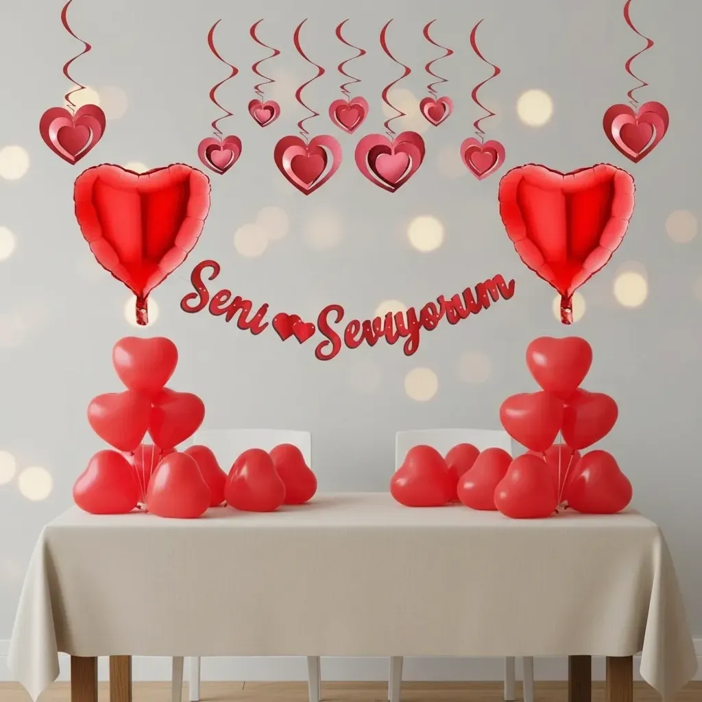 Seni Seviyorum Kırmızı Kaligrafi Banner 30x150 cm, fiyatı3D Kalp Asmalı Tavan Süsü Kırmızı 12 Adet