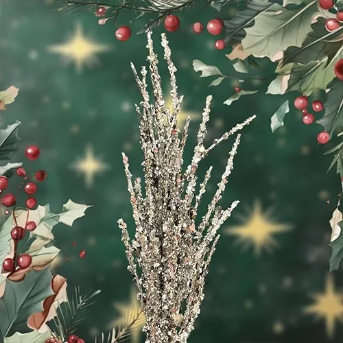 40 cm uzunluğunda, ince ve şık yapısıyla yılbaşı dekorlarına zarif bir dokunuş katan gümüş simli yapay çiçek. Parlak sim detayları ışığı güzel yakaladığı için özellikle masa üstünde, raflarda veya küçük vazolarda oldukça gösterişli durur.